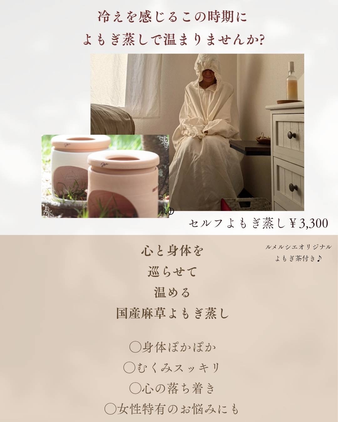 ルメルシェー国産麻草よもぎ蒸し+インナーケアカウンセリングハーブについて