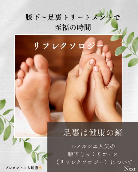 ルメルシェのリフレクソロジーは体調をお伺いして、その時の体調や気分に合わせた香り(精油)を使ってトリートメントするのでよりリラックスしていただけると思います。