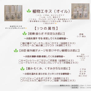 今日はどの植物エキス(オイル)に助けてもらおうかな♡と選ぶのも毎回楽しいですよ♡