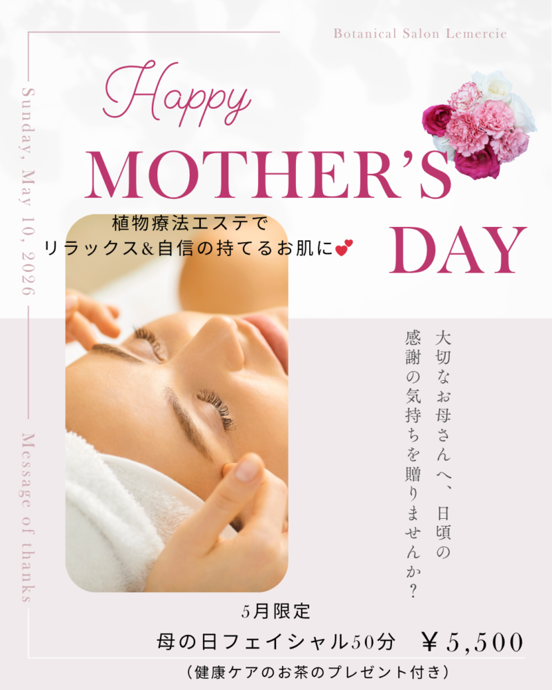 ルメルシェでは【母の日プレゼント 植物療法エステ】を5月限定でご用意いたします。
